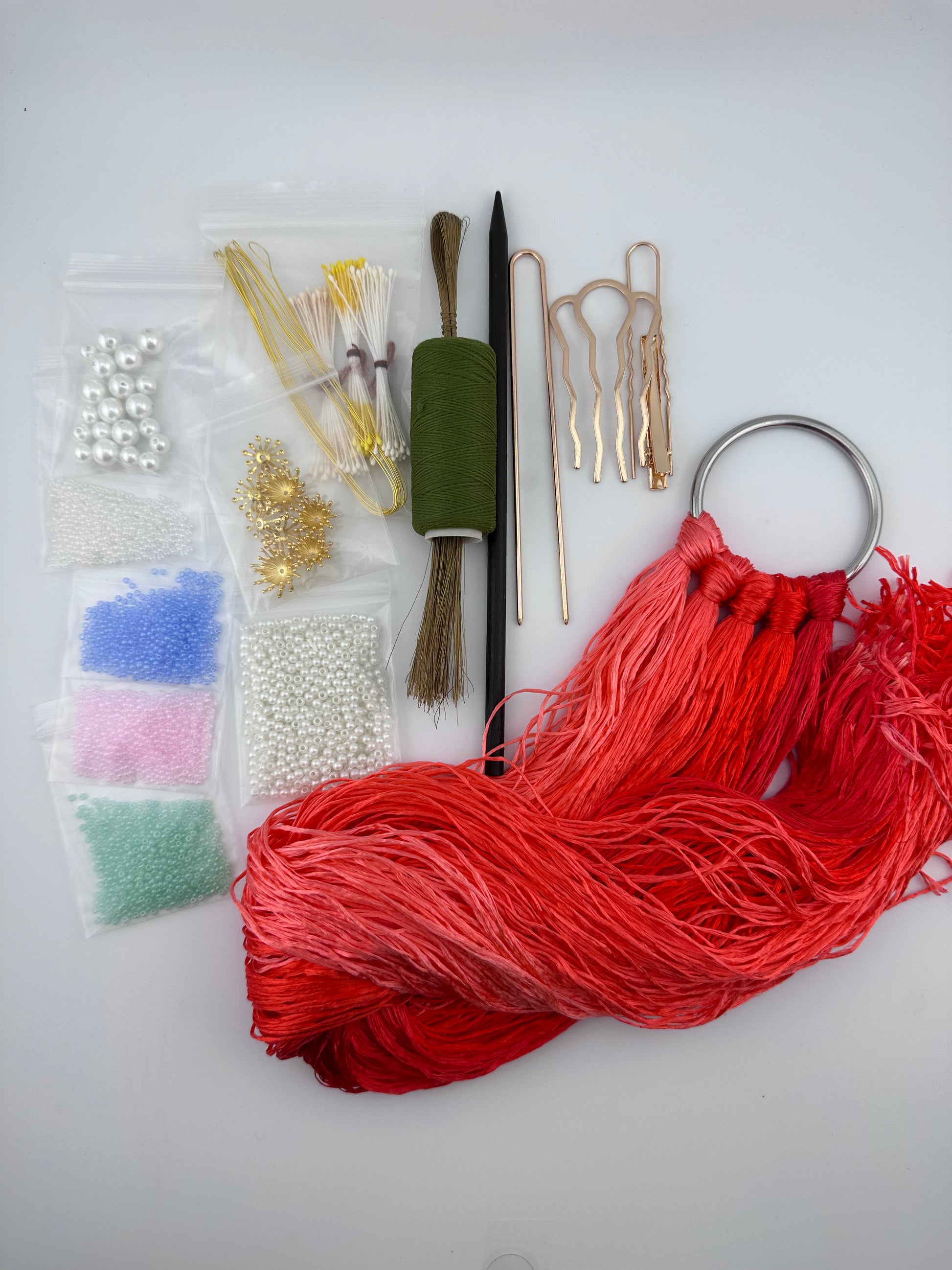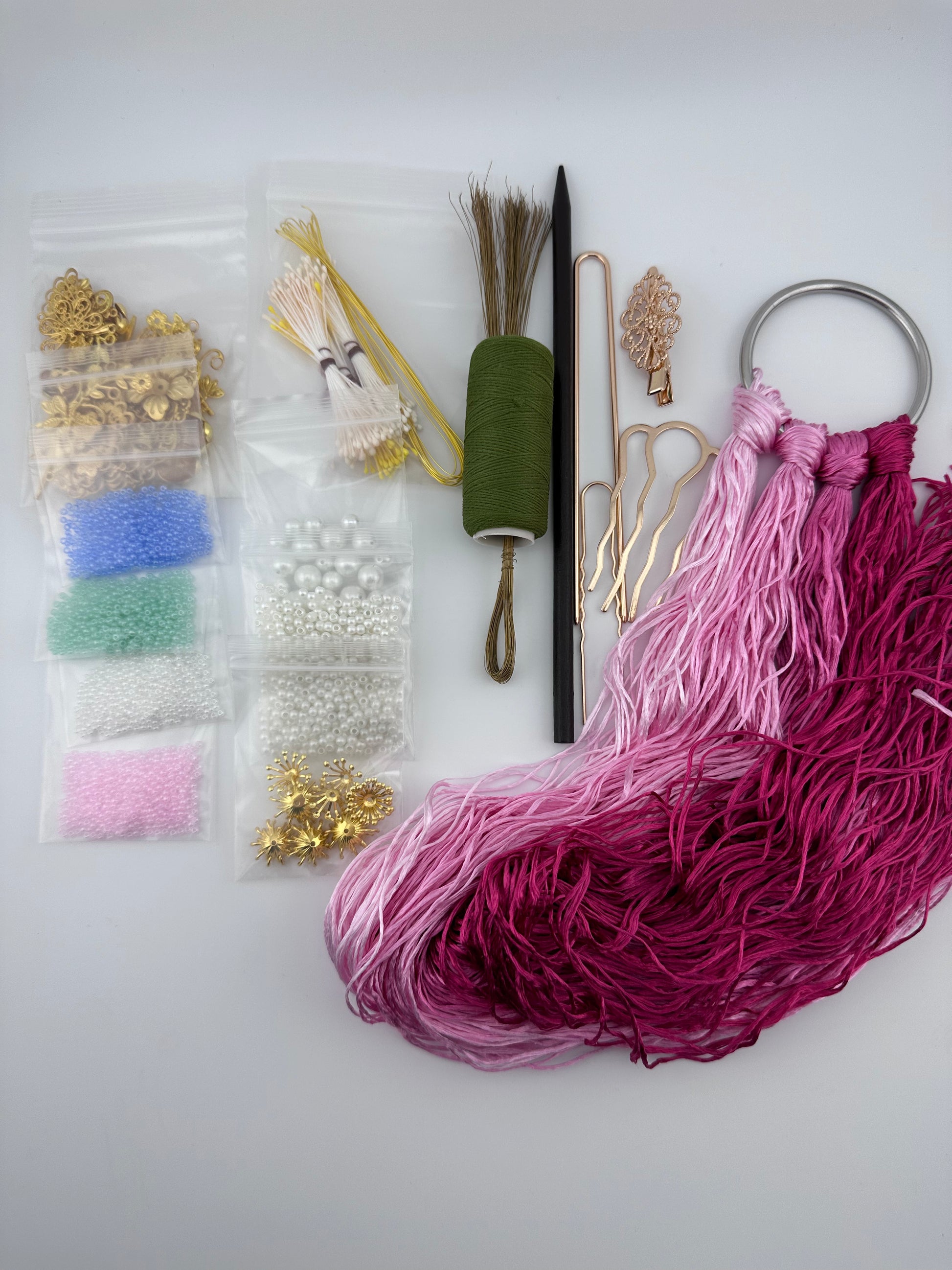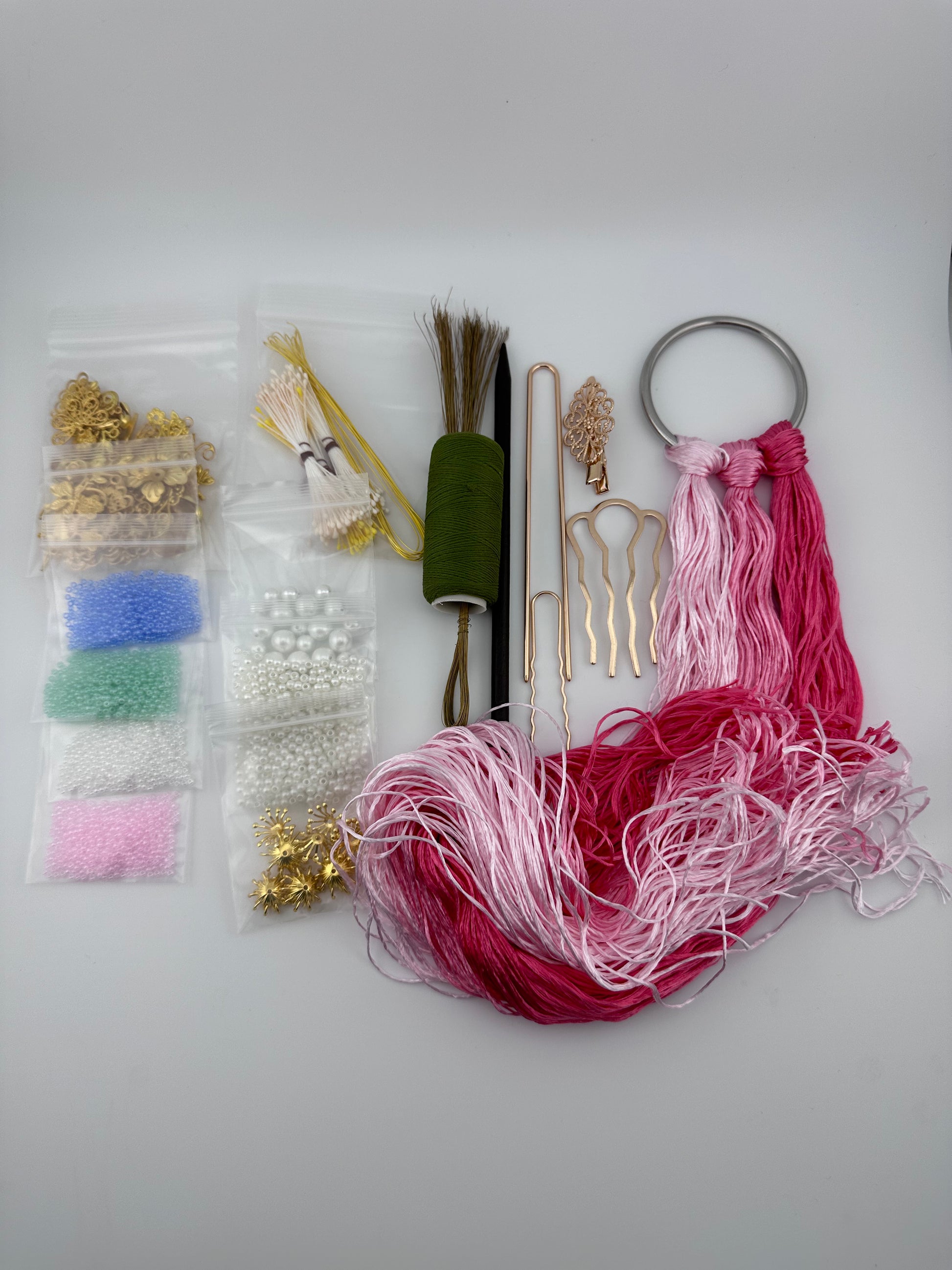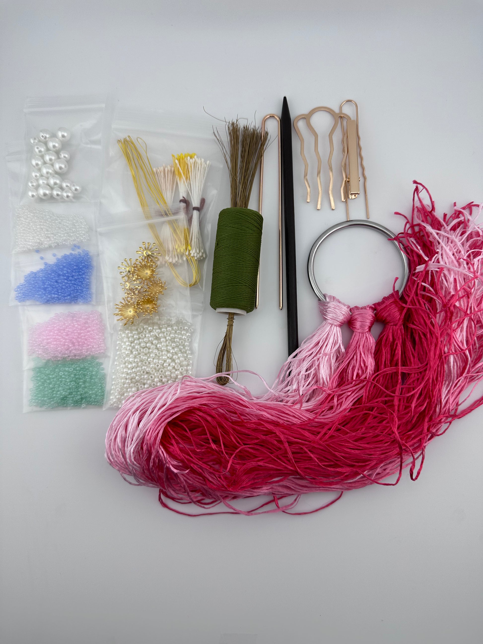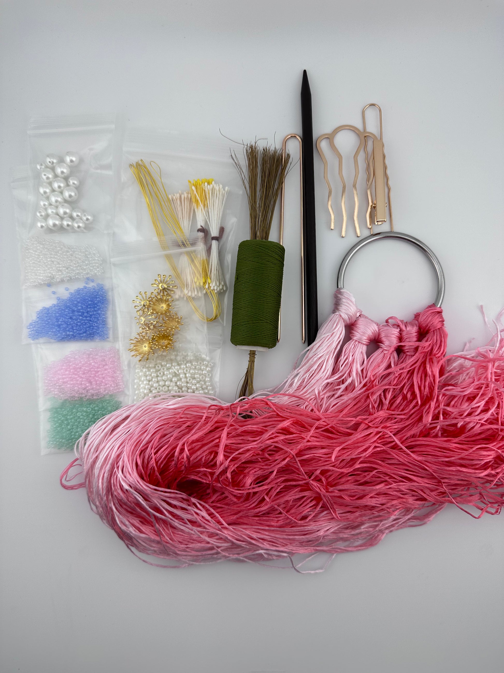 Seed beads: 4 colors, half a teaspoon each (Pink, white, green, blue, we will have more colors in the future)